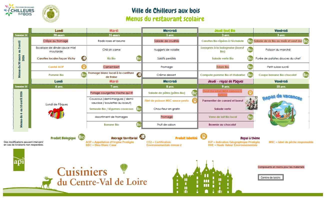 Vous pouvez prendre connaissance de ces menus : https://chilleurs-aux-bois.fr/les-menus/